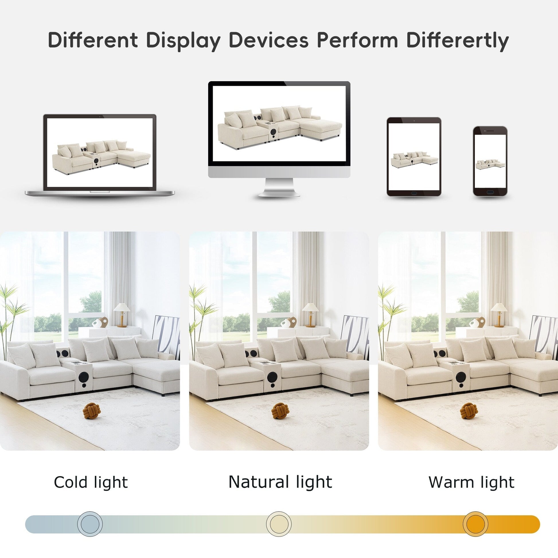 Ce canapé d'angle modulable en velours côtelé allie confort et fonctionnalités astucieuses pour un style de vie moderne. Avec ses porte-gobelets intégrés, ses rangements, ses enceintes Bluetooth et sa recharge filaire et sans fil, il est un ajout confortable et technologique à tout salon ou appartement.