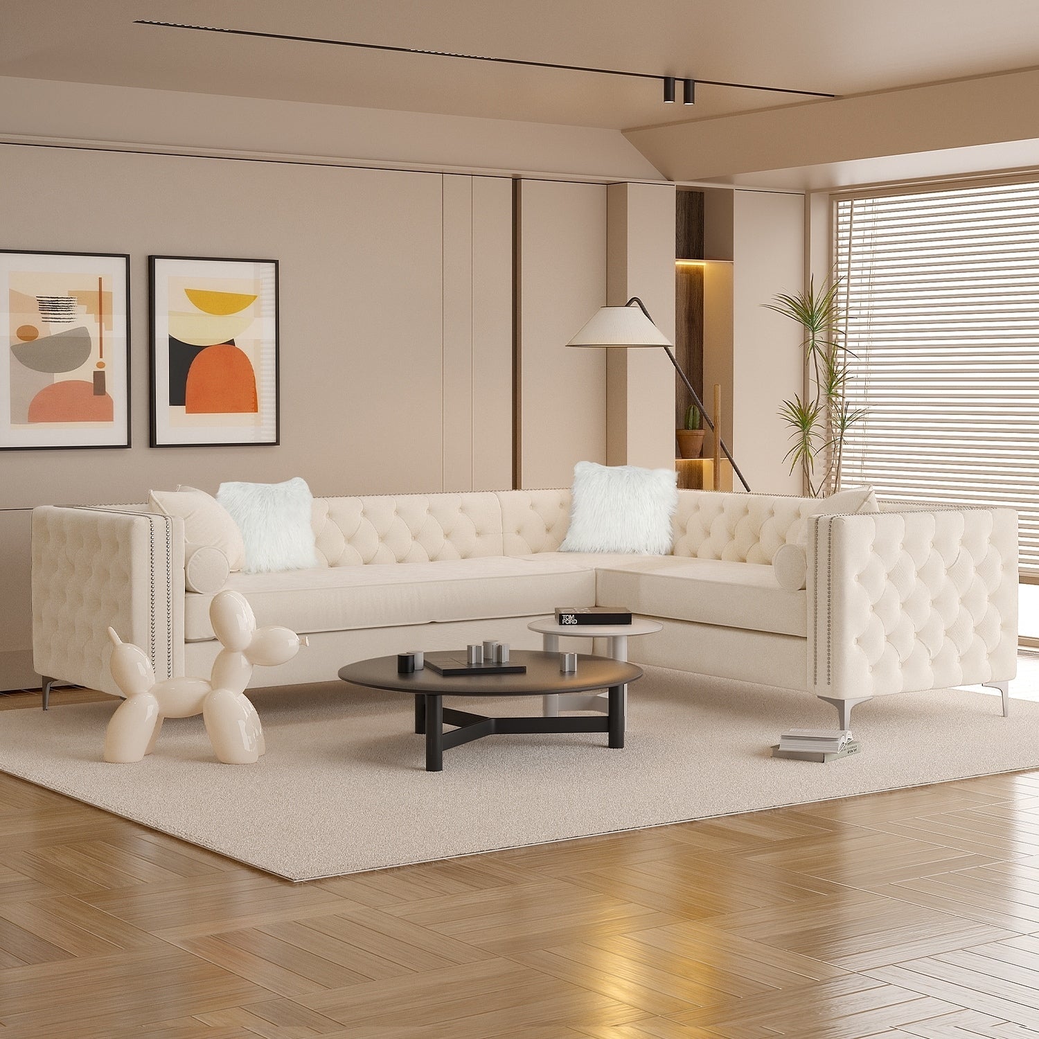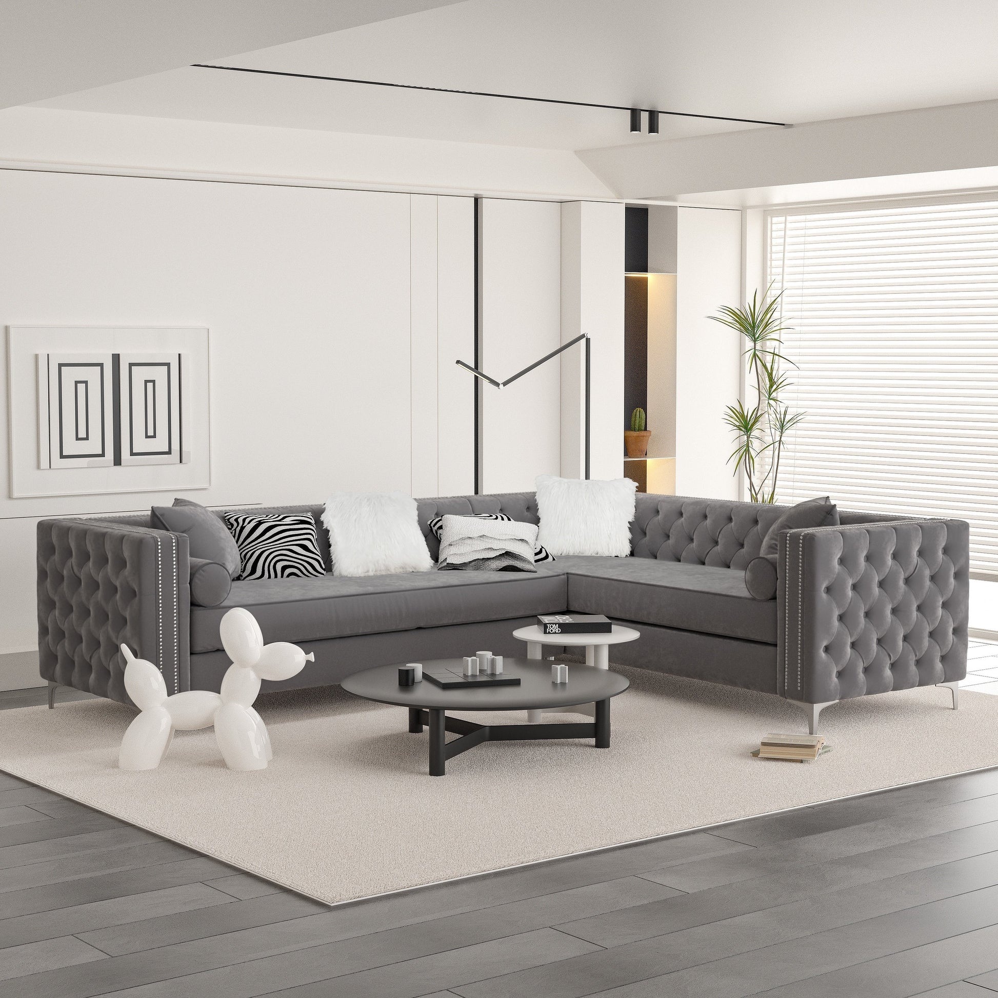 Détails: Un velours riche est capitonné à l'intérieur comme à l'extérieur de la structure, un détail de design élégant visible sous tous les angles. Des coussins simples permettent d'accueillir confortablement plusieurs personnes sans séparation. Ce canapé d'angle est rehaussé de deux rangées de clous décoratifs nickelés qui s'harmonisent à merveille. Il s'intègre aussi bien aux intérieurs traditionnels que contemporains. Confort et style sont au rendez-vous dans ce canapé dynamique. Ce canapé d'angle est doté d'un velours capitonné aux teintes riches, rehaussé de clous décoratifs argentés contrastants qui mettent en valeur des accoudoirs carrés épurés, d'un rembourrage en mousse haute densité, de coussins amovibles et de solides pieds en Y en métal chromé argenté assorti. Avec ce canapé d'angle, le traditionnel rencontre le moderne pour un résultat tout simplement spectaculaire.