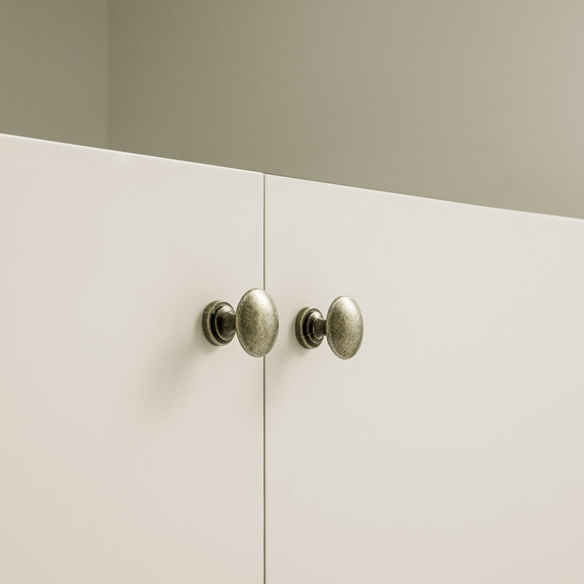 Complétez le look : sur la photo avec notre buffet festonné Henley de 150 cm de large, vous trouverez la table d'appoint festonnée Henley assortie également en sable clair et notre chaise de salle à manger en bois Hansel en taupe clair.