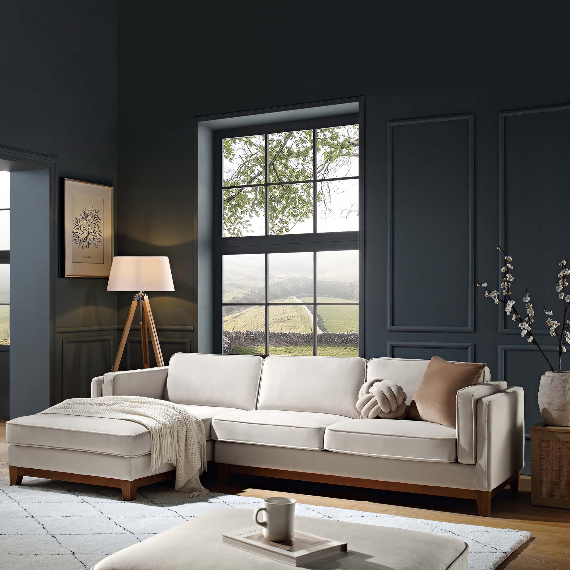 Canapé Dipley en velours champagne, canapé Grande Chaise, orientation gauche
