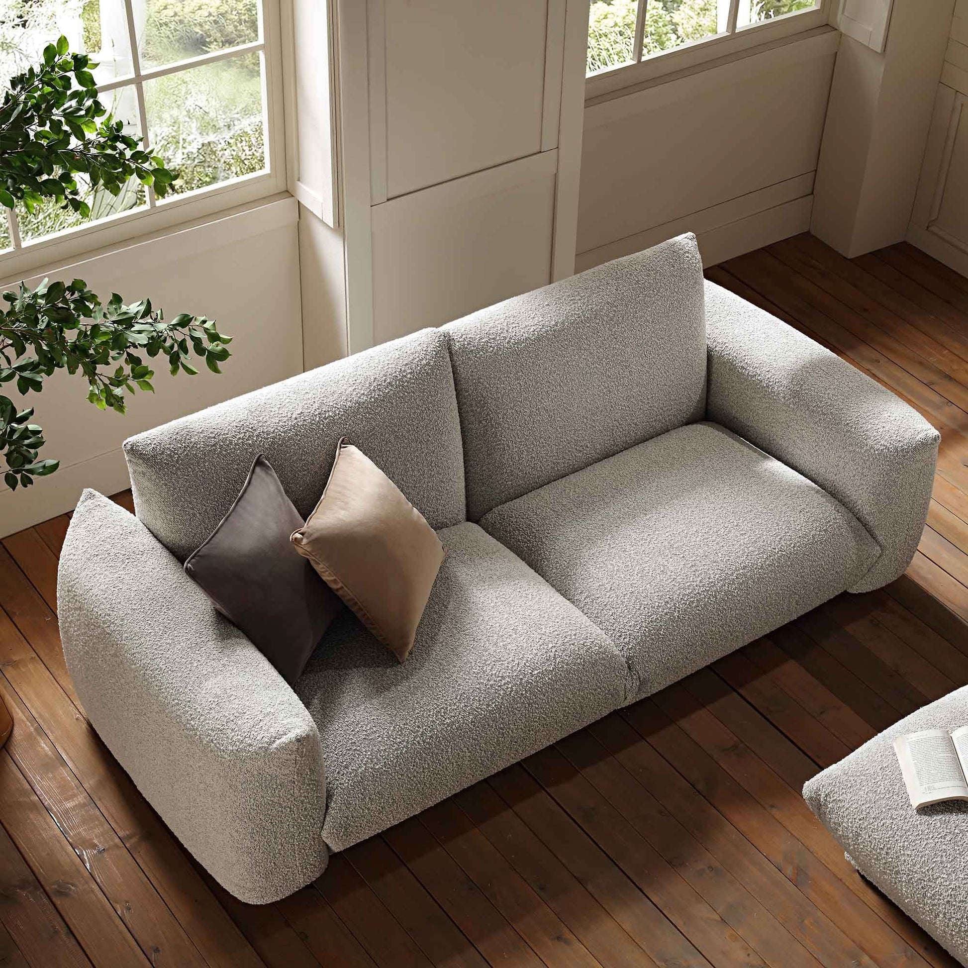 - Recouvert d'un tissu bouclé gris brume chic pour un look contemporain.