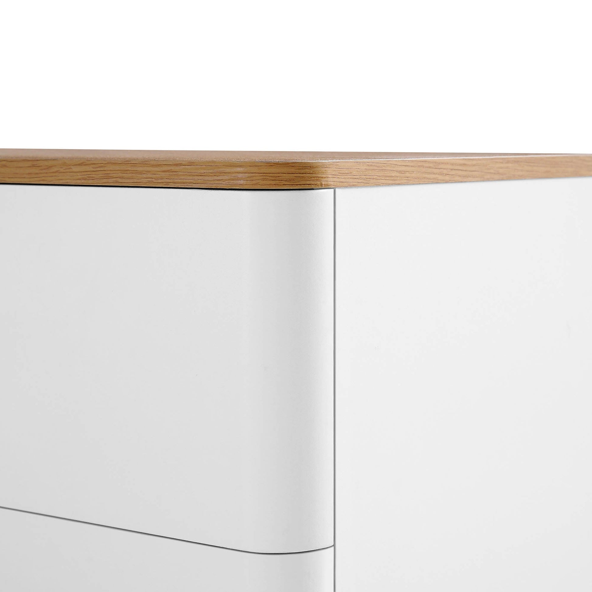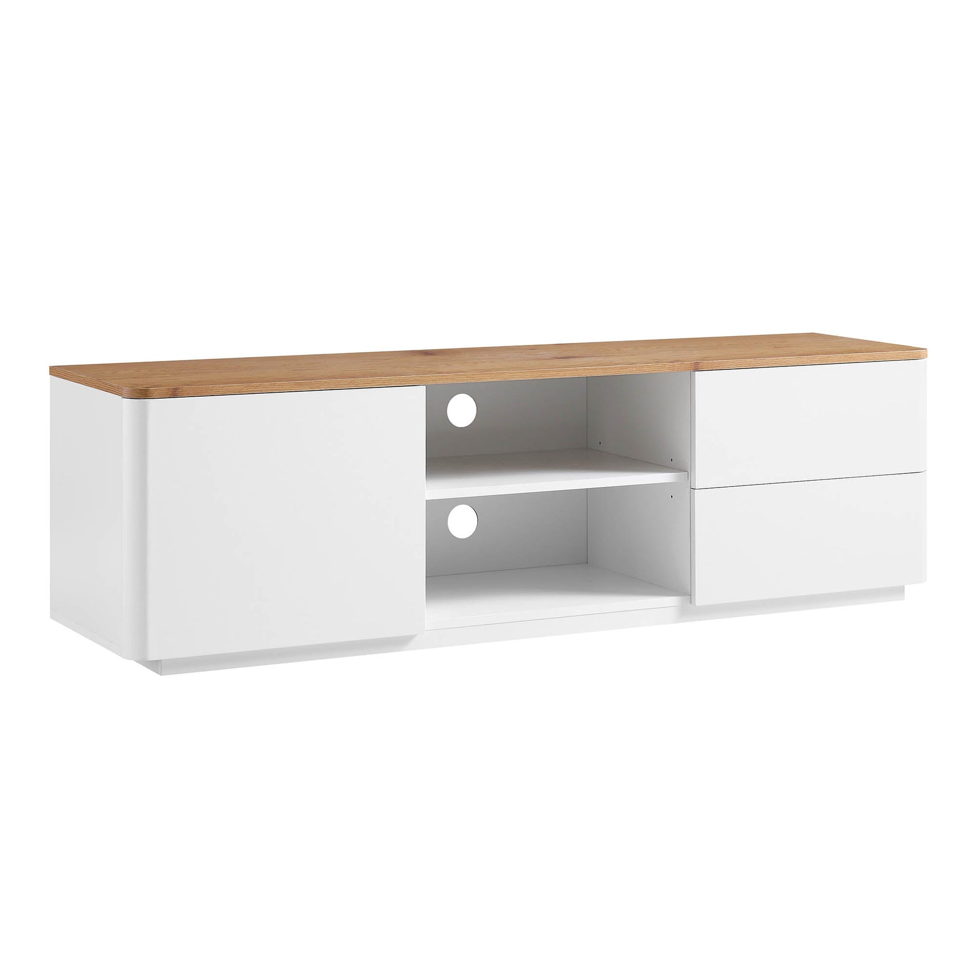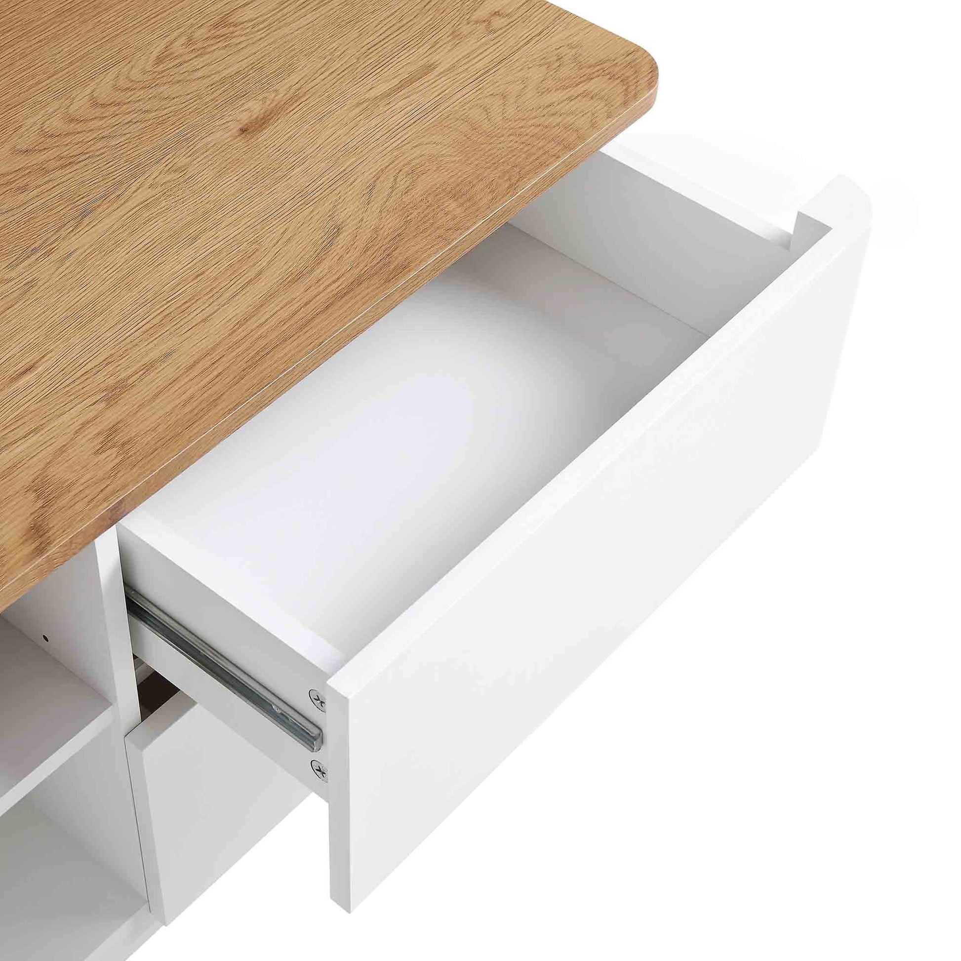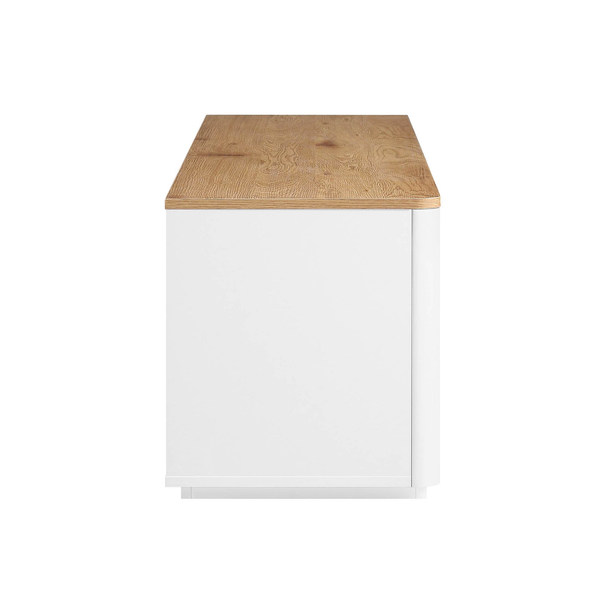 Le meuble TV présente des coins incurvés, coordonnés avec un cadre blanc cassé mat et un plateau en chêne. pour un look doux et chaleureux.