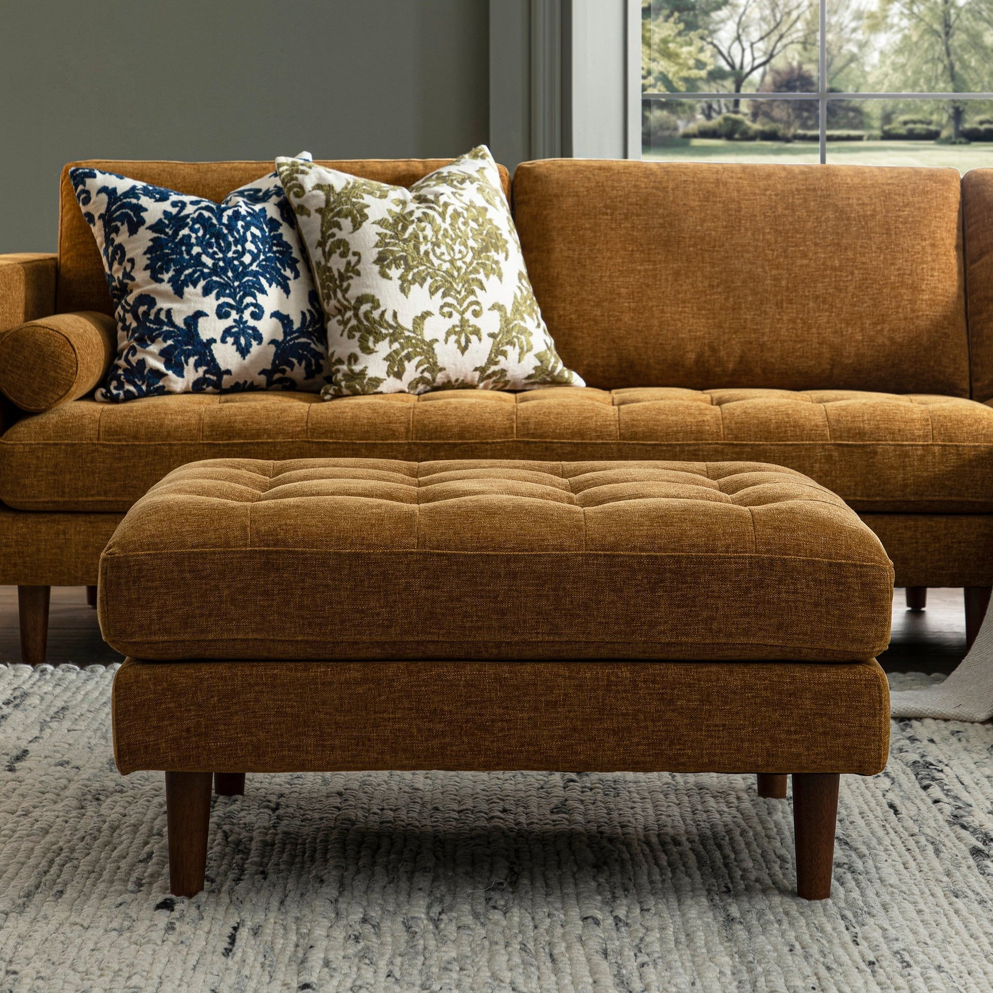 • Rembourré d'un magnifique tissu chenille couleur épices avec pieds en bois massif avec finition teintée couleur noyer.