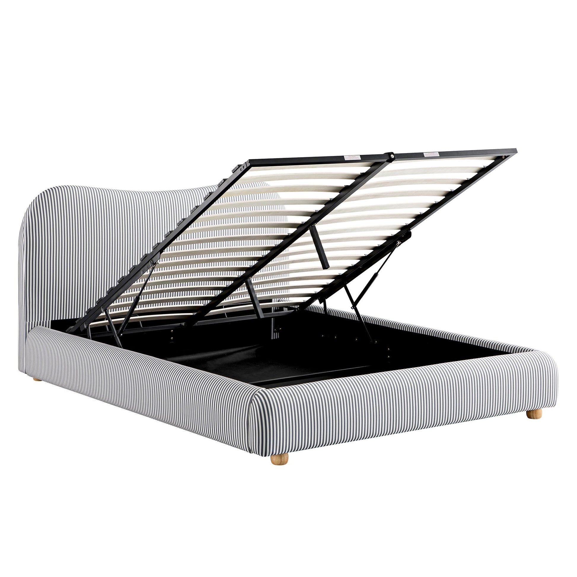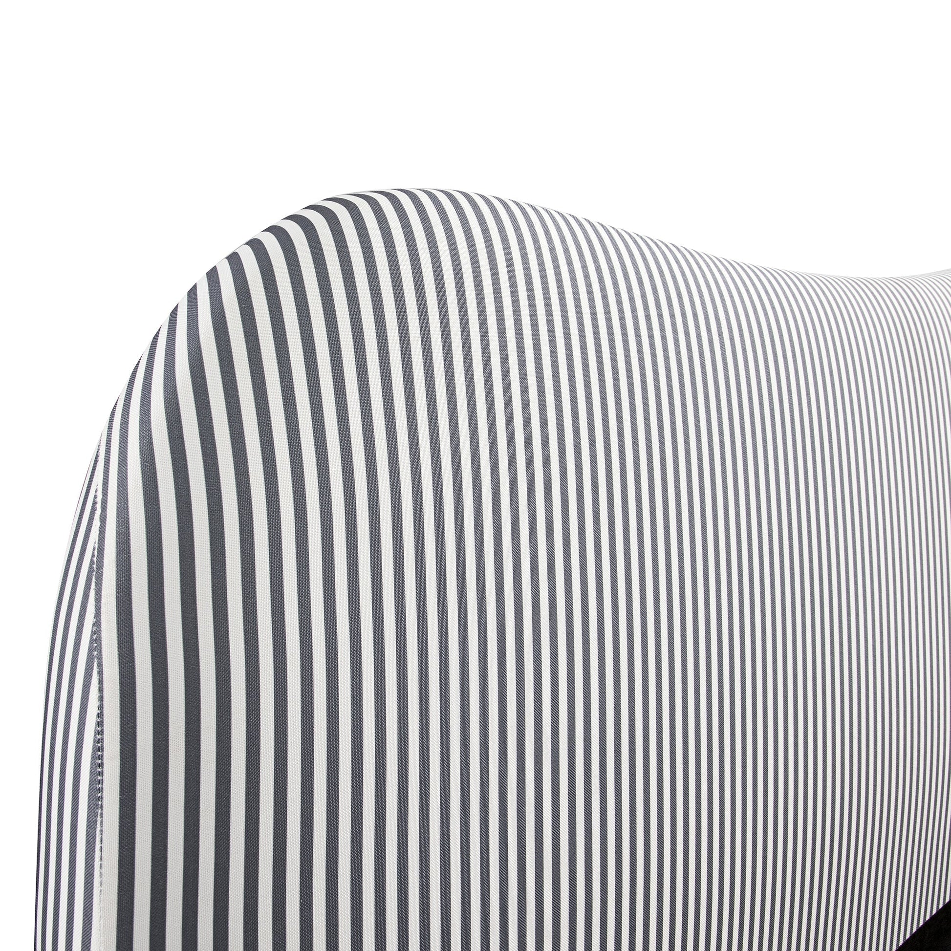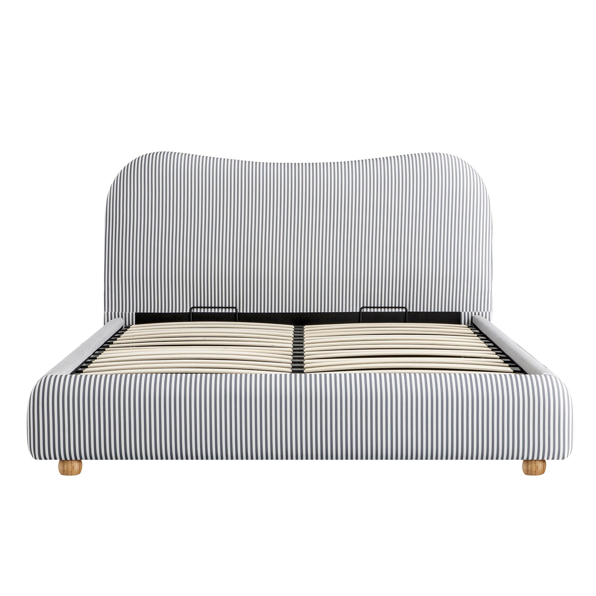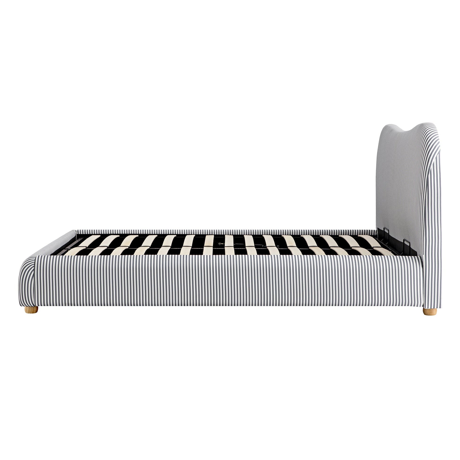 Notre lit Egerie présente une silhouette incurvée invitante, recouverte d'un tissu rayé bleu ardoise chic pour un look frais.