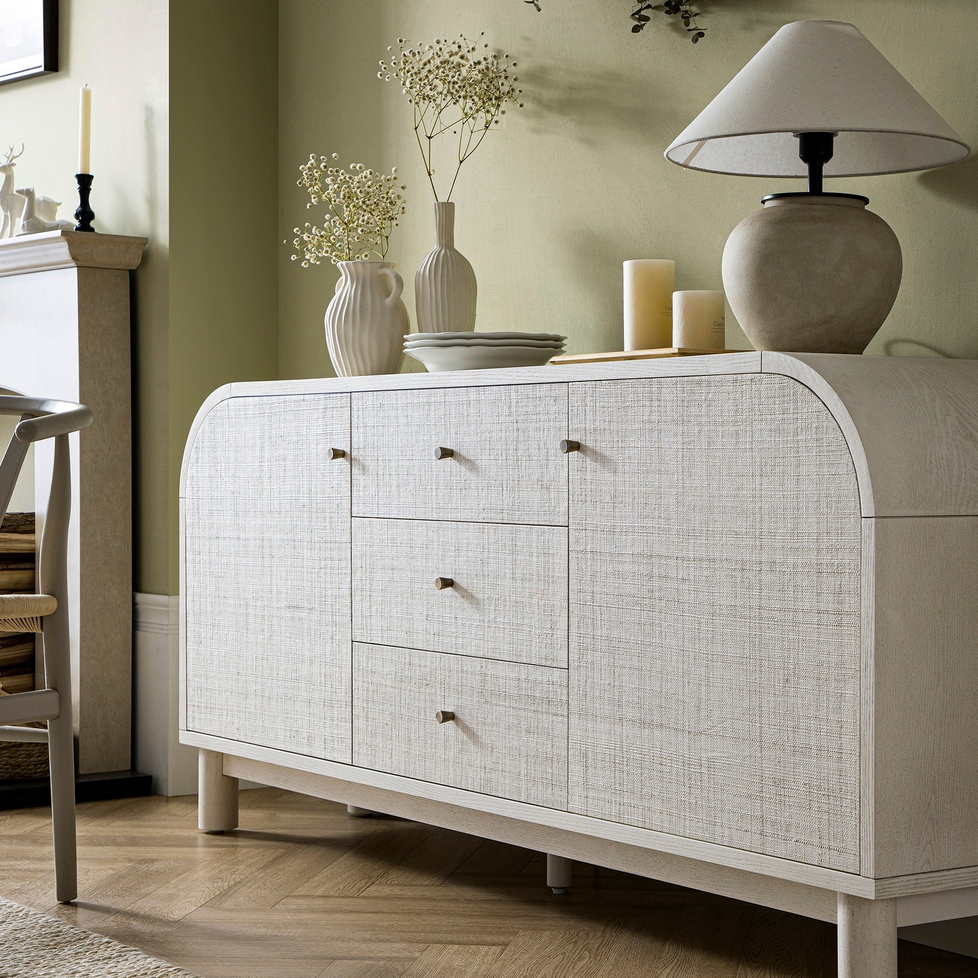 Complétez le look : sur la photo avec notre buffet large à 3 tiroirs en raphia blanc délavé Maude, nous trouvons notre tapis en jute crème tressé à la main Aurora et notre chaise de salle à manger en tissage naturel à cadre en bois taupe clair Hansel .