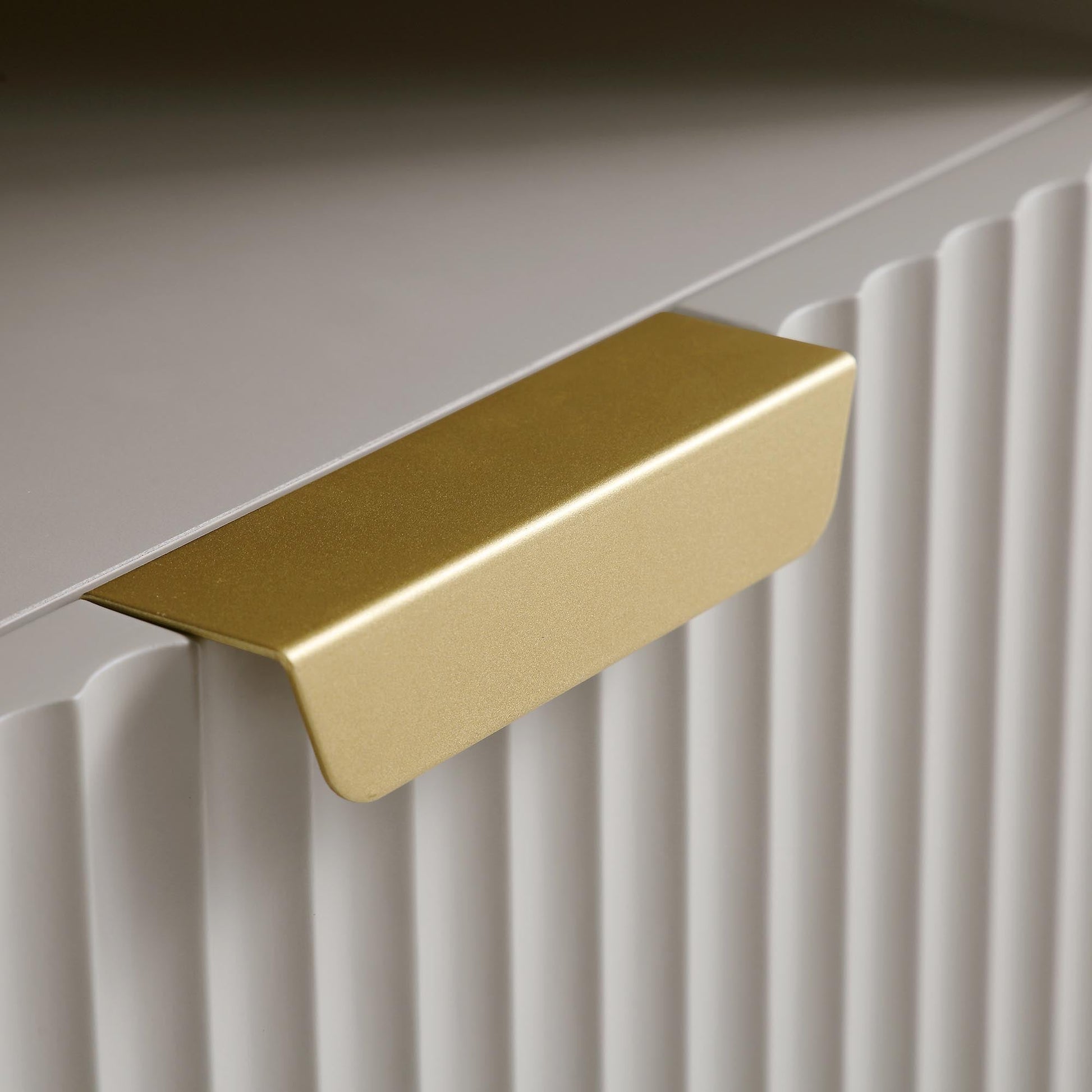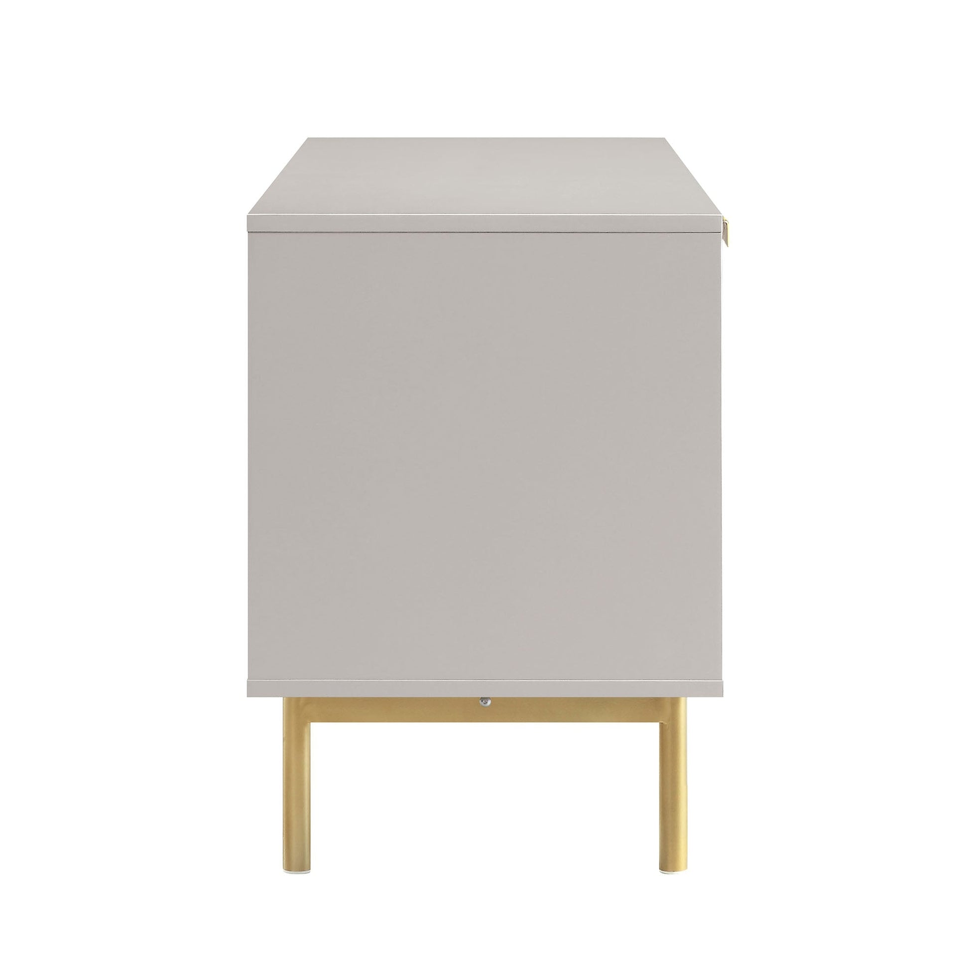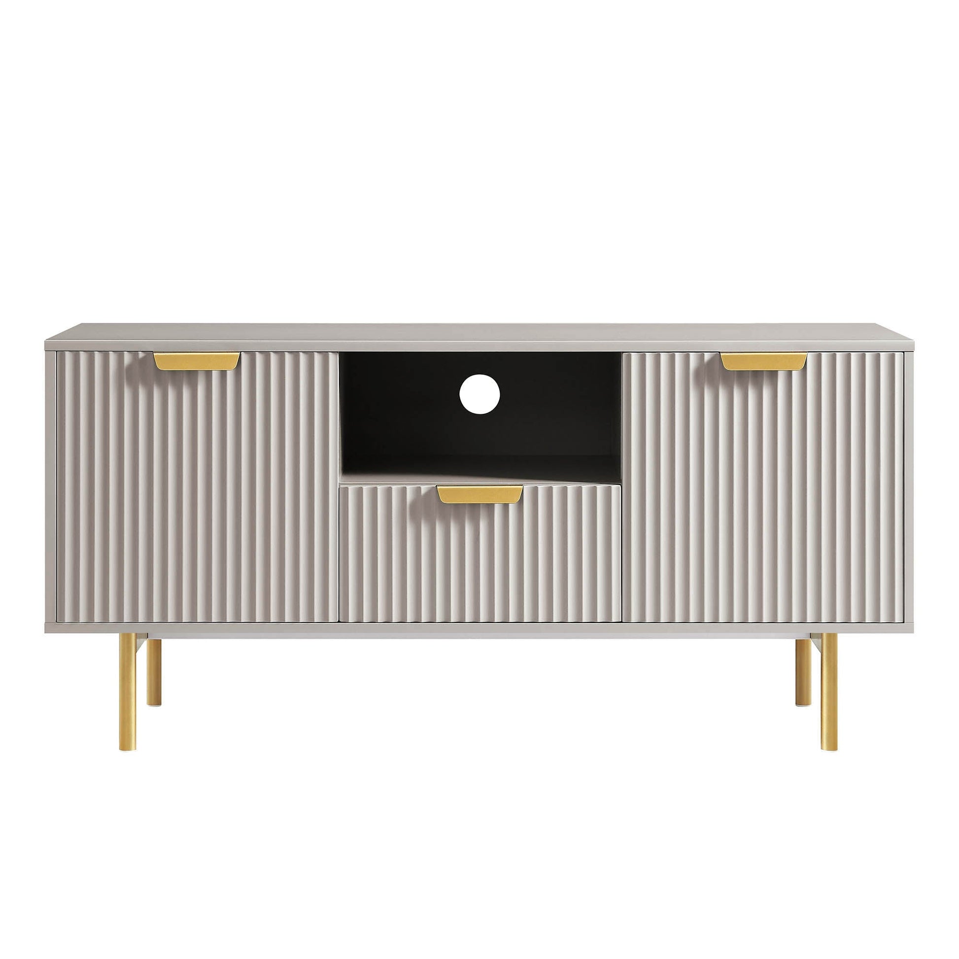 • Le meuble TV de 47 pouces de large présente une façade nervurée avec une finition en peinture taupe mate, complétée par des poignées et des pieds contrastants à effet doré.