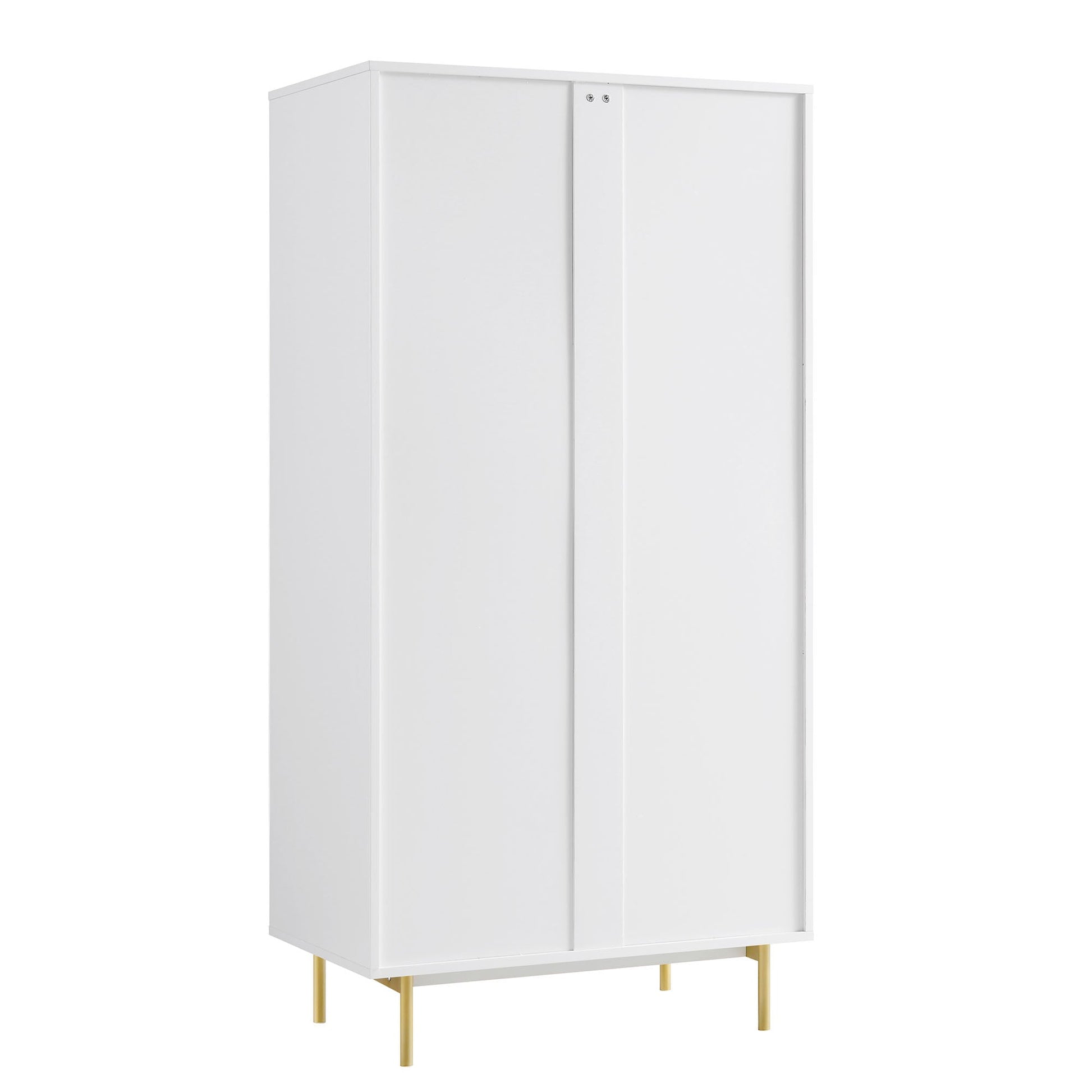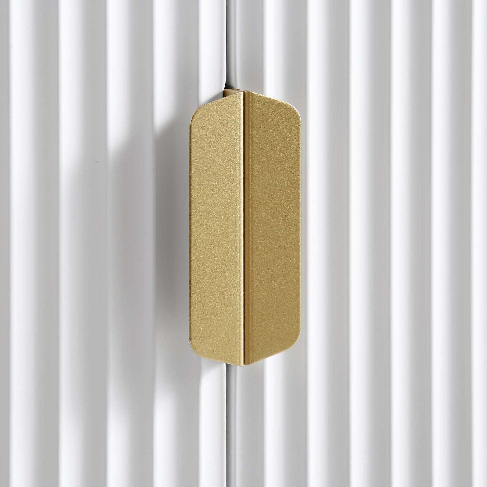 Le placard est doté de portes striées élégantes et d'une façade de tiroir finie en peinture blanche mate, associée à des poignées et des pieds dorés.