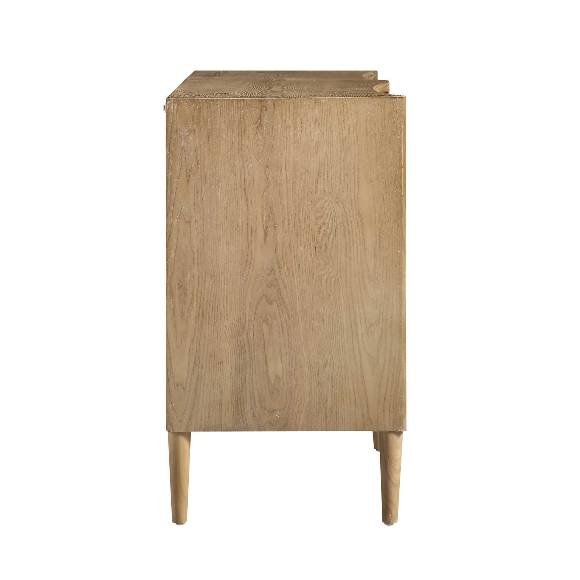Les façades de tiroirs légèrement concaves sont complétées par des poignées en métal en laiton vieilli en forme de clou de girofle.
