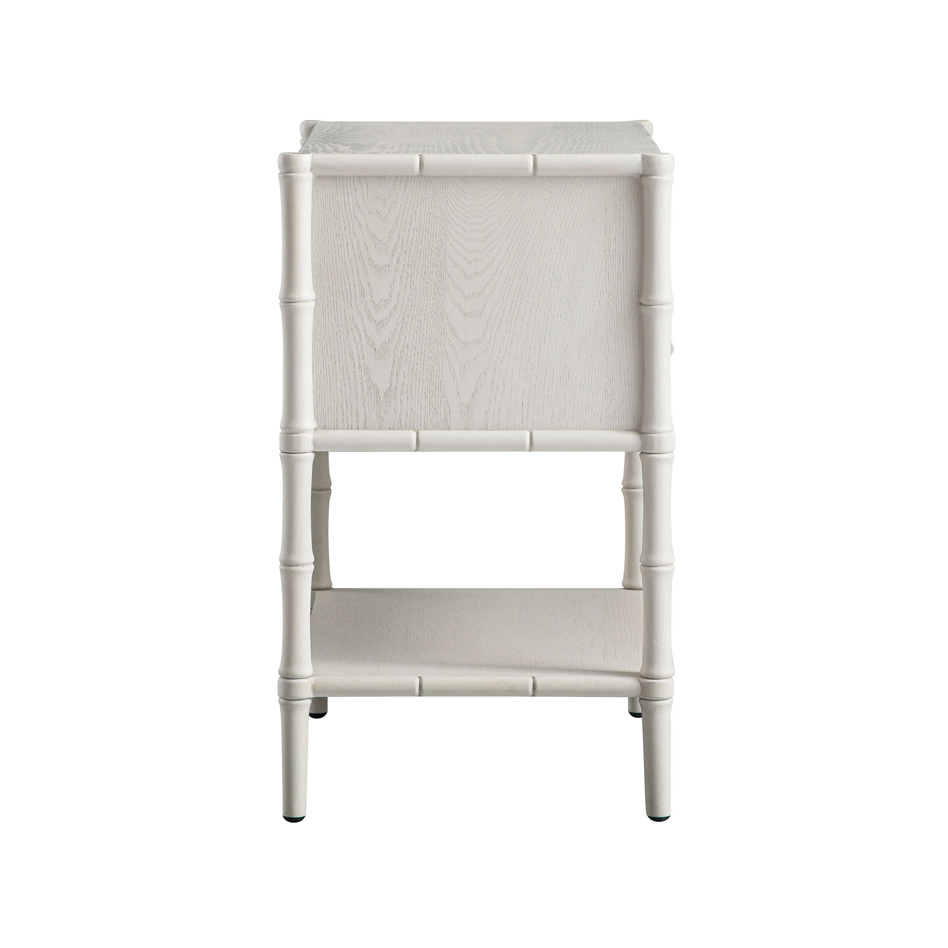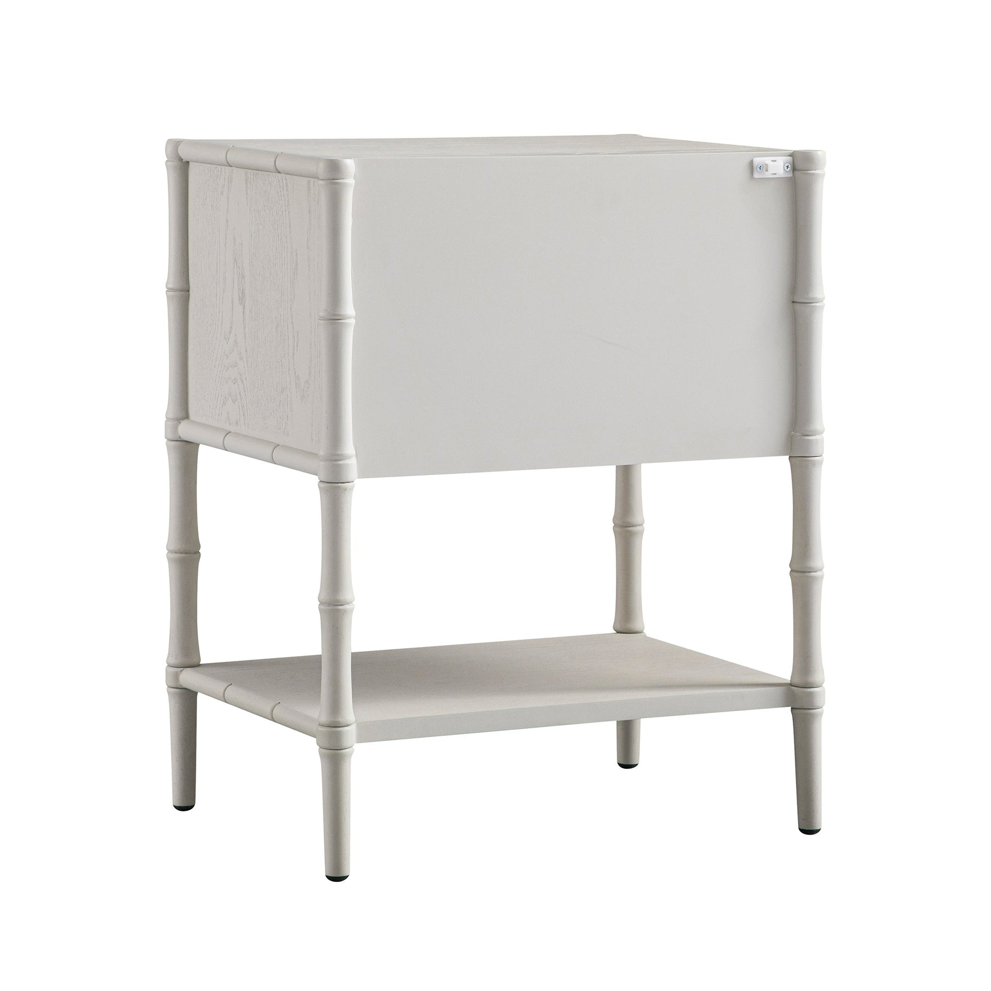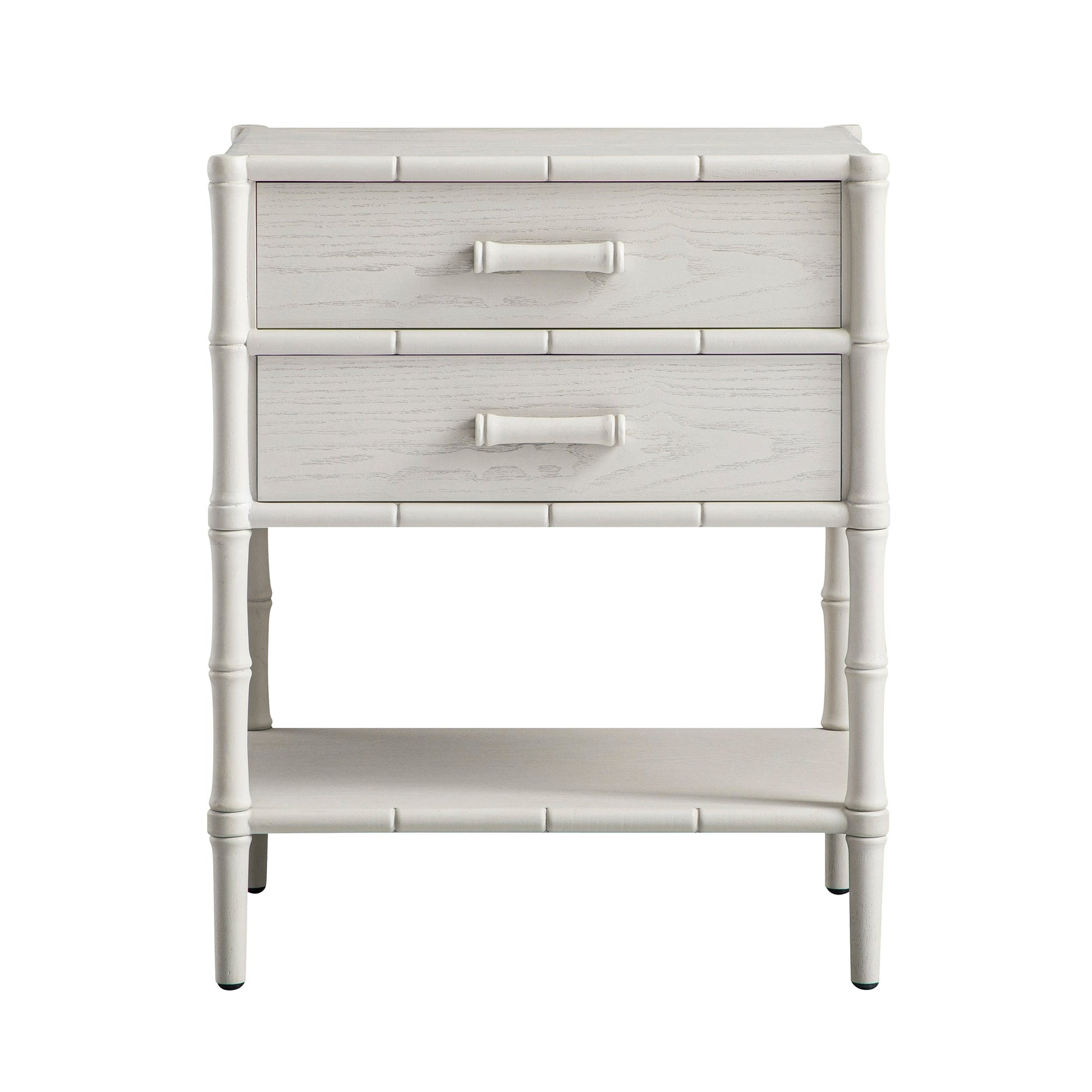 Deux tiroirs avec poignées en faux bambou offrent un grand espace de rangement pour vos essentiels, tandis qu'une étagère inférieure pleine largeur ajoute un espace supplémentaire pour les livres, les paniers décoratifs ou vos lectures nocturnes préférées.