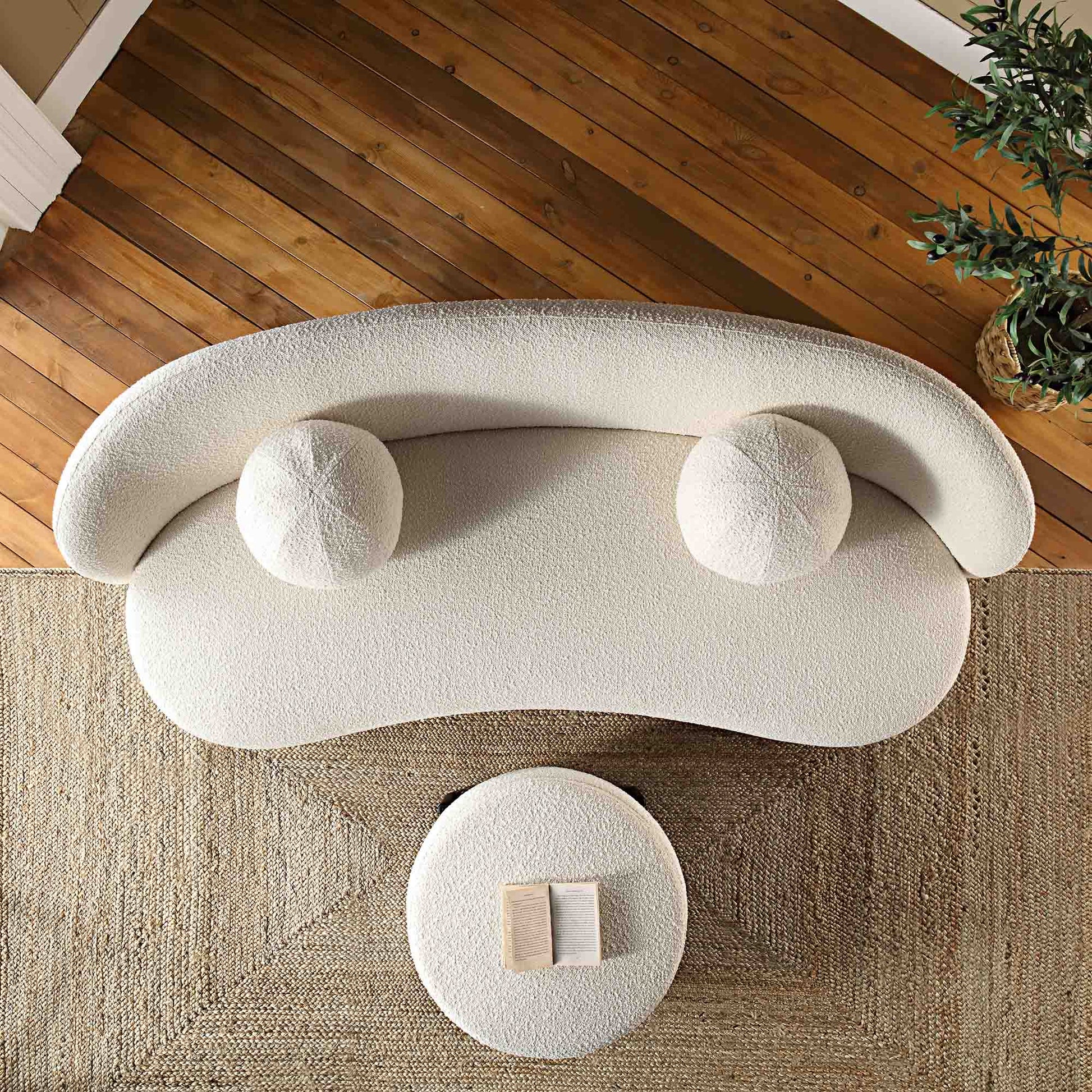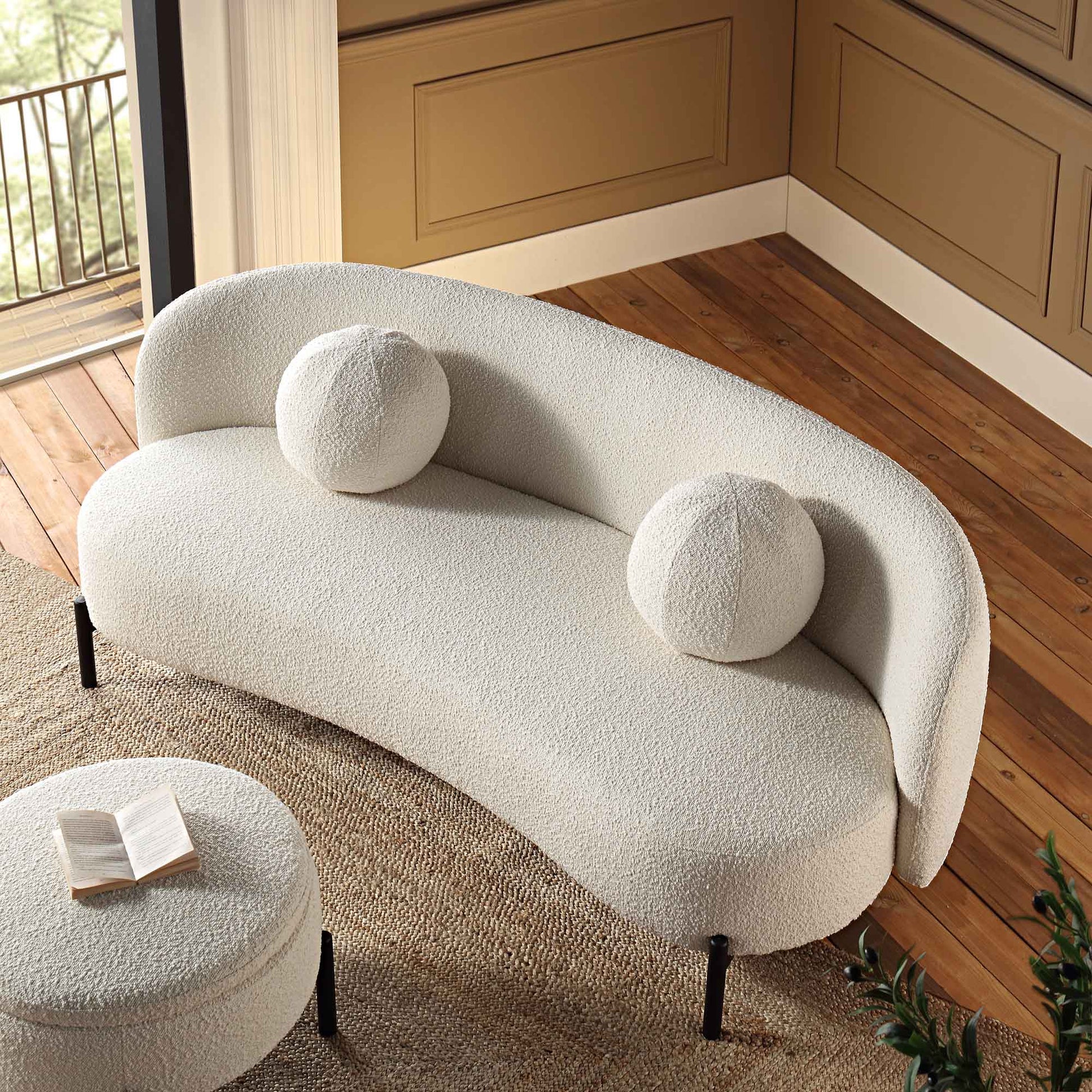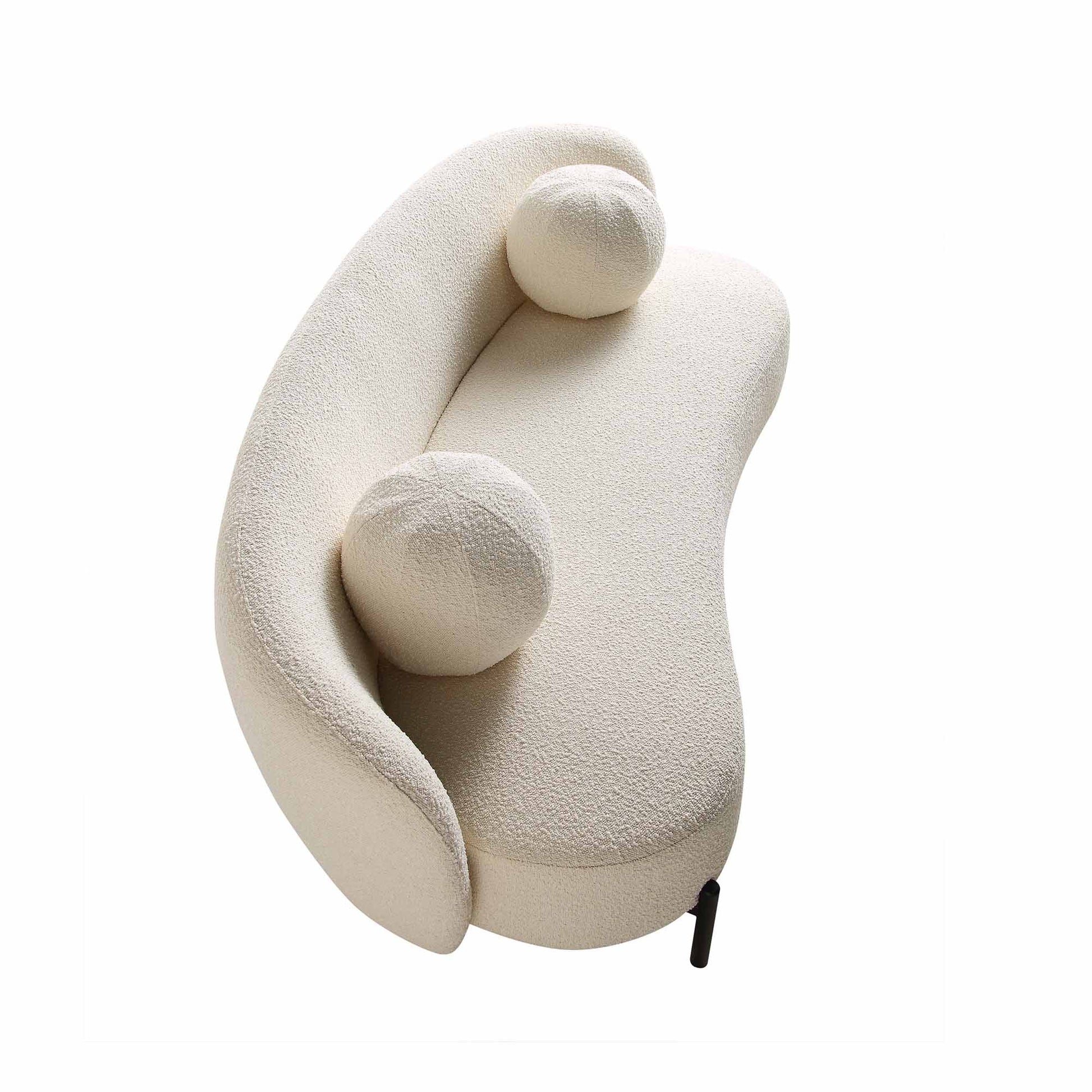 Canapé Amboise 3 places courbé avec coussins boules, écru bouclé