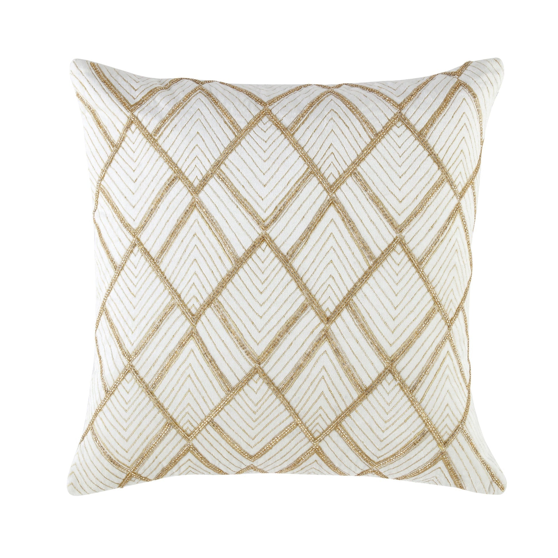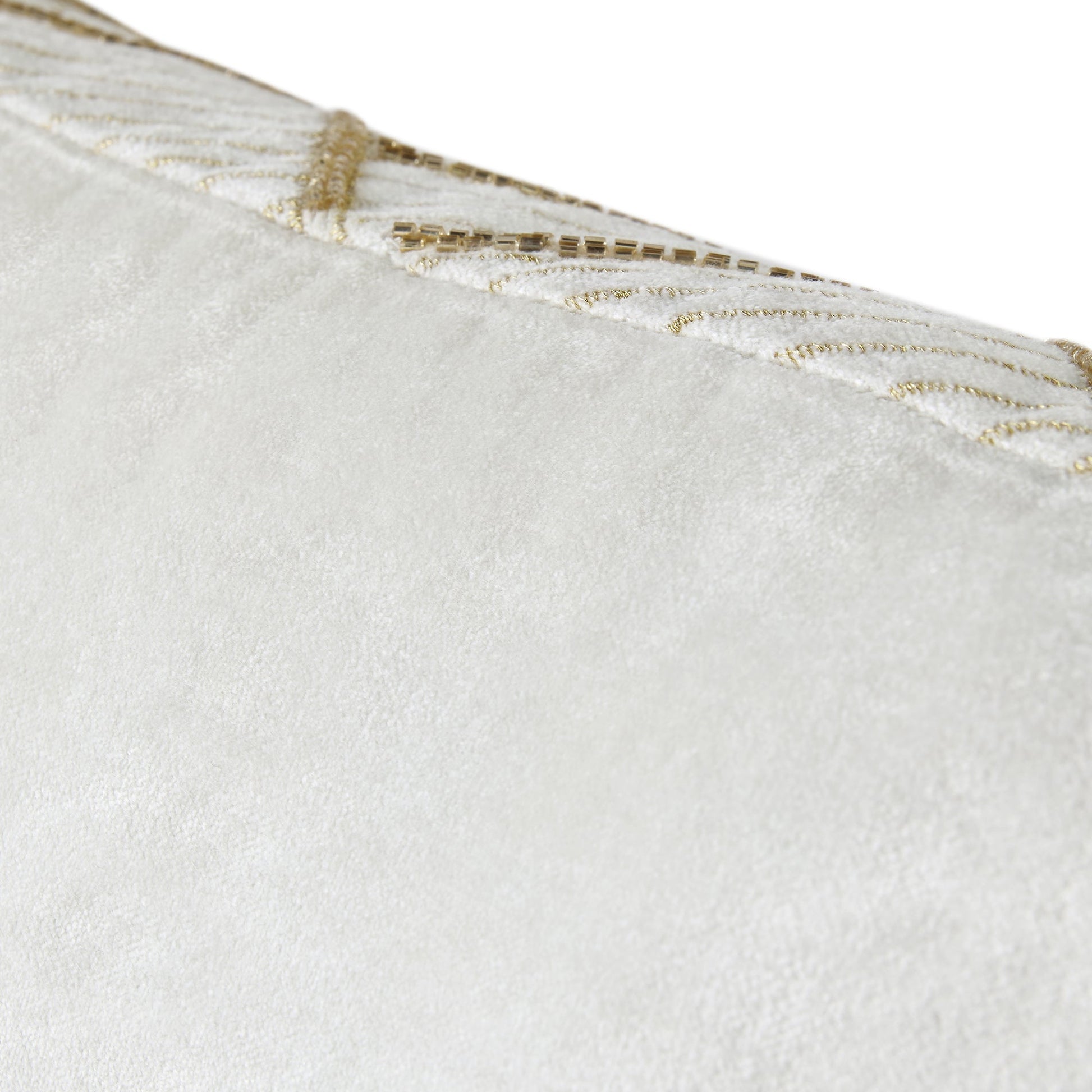 L'oreiller Empire a été confectionné en somptueux velours de coton blanc perle et joliment orné de perles dorées et de motifs inspirés de l'art déco brodés, ce qui en fait la solution parfaite pour une décoration glamour.