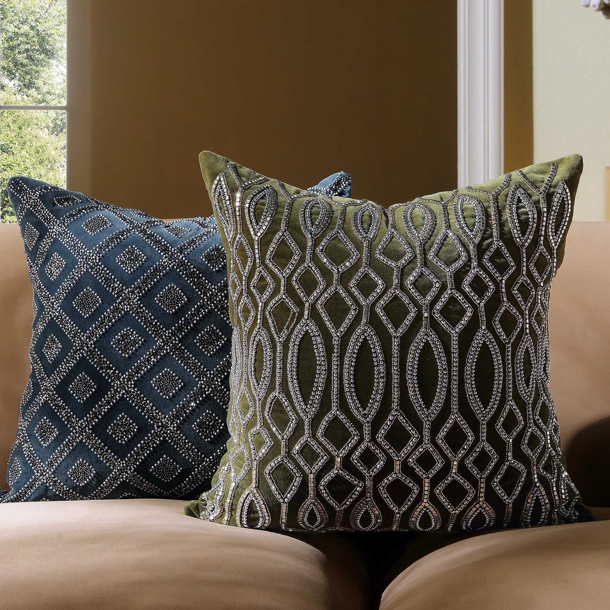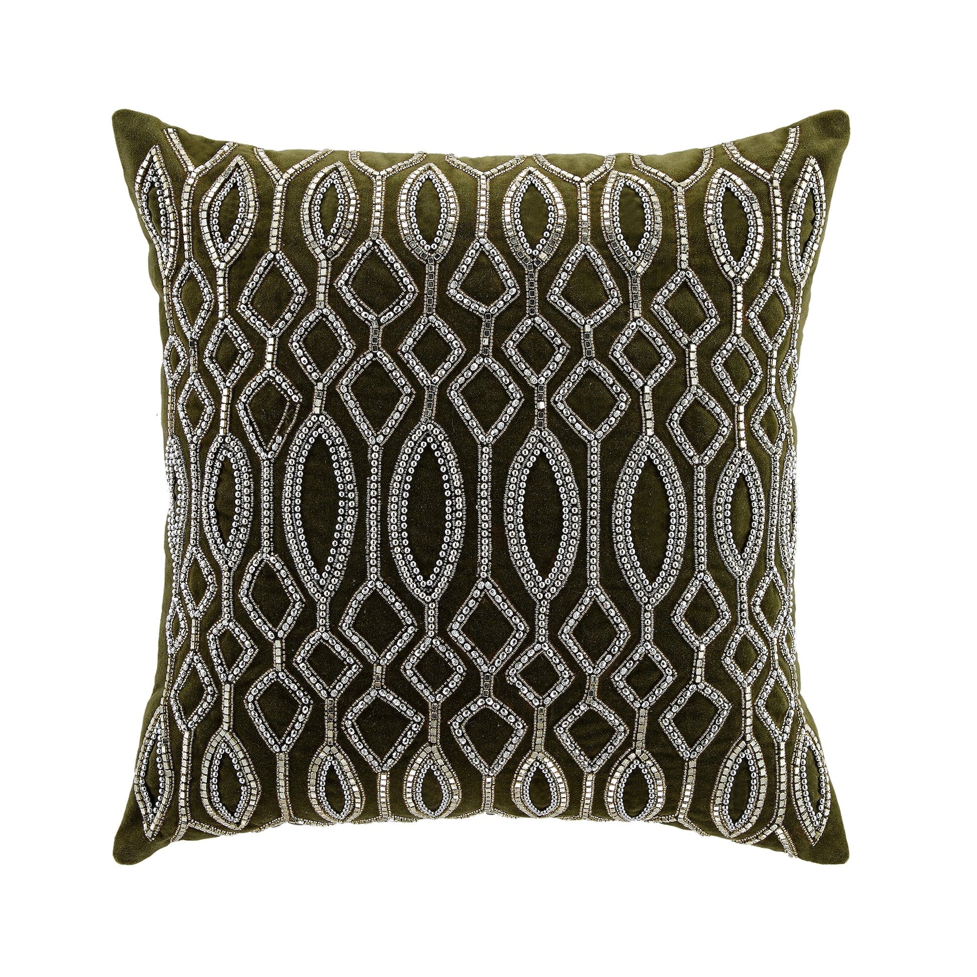 • Le coussin Verona est une pièce maîtresse qui ne manquera pas de faire sensation. Fabriqué à la main en Inde à partir d'un somptueux velours 100 % coton vert mousse et joliment orné de perles métalliques argentées, ce coussin est la solution idéale pour une décoration glamour.