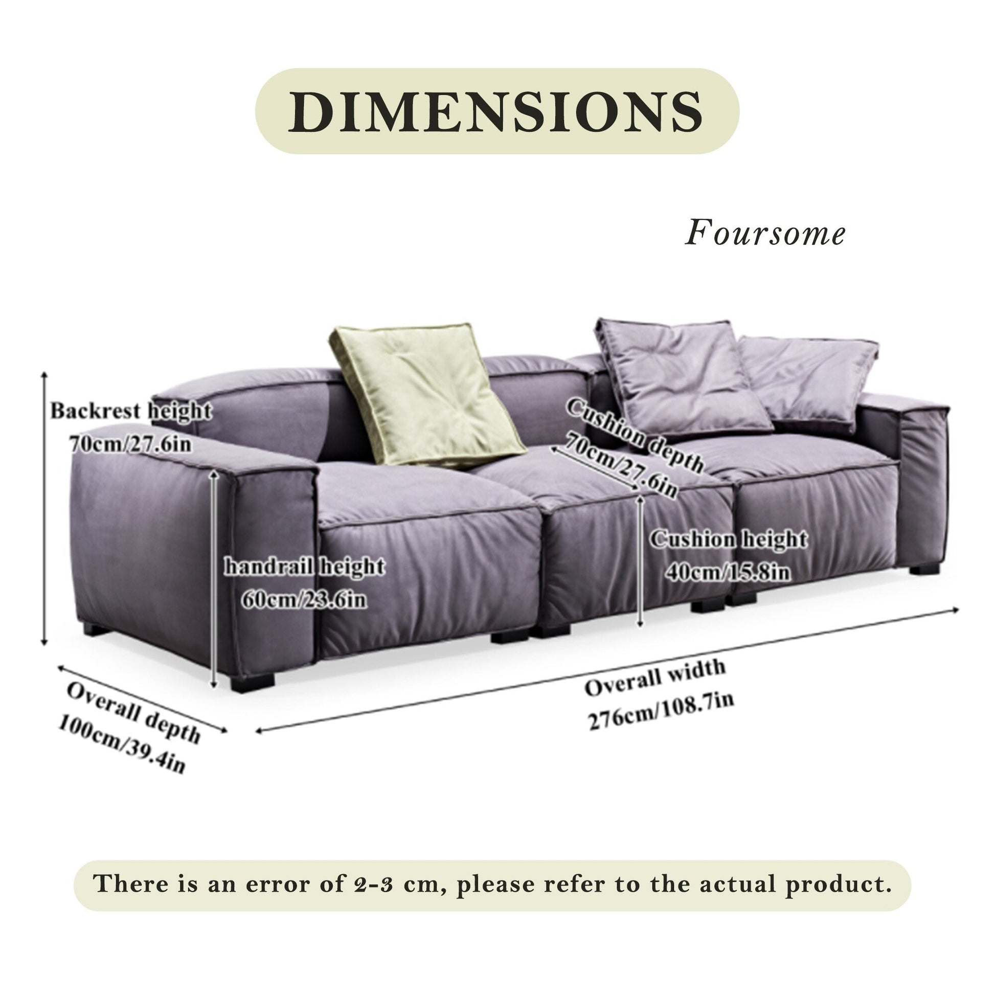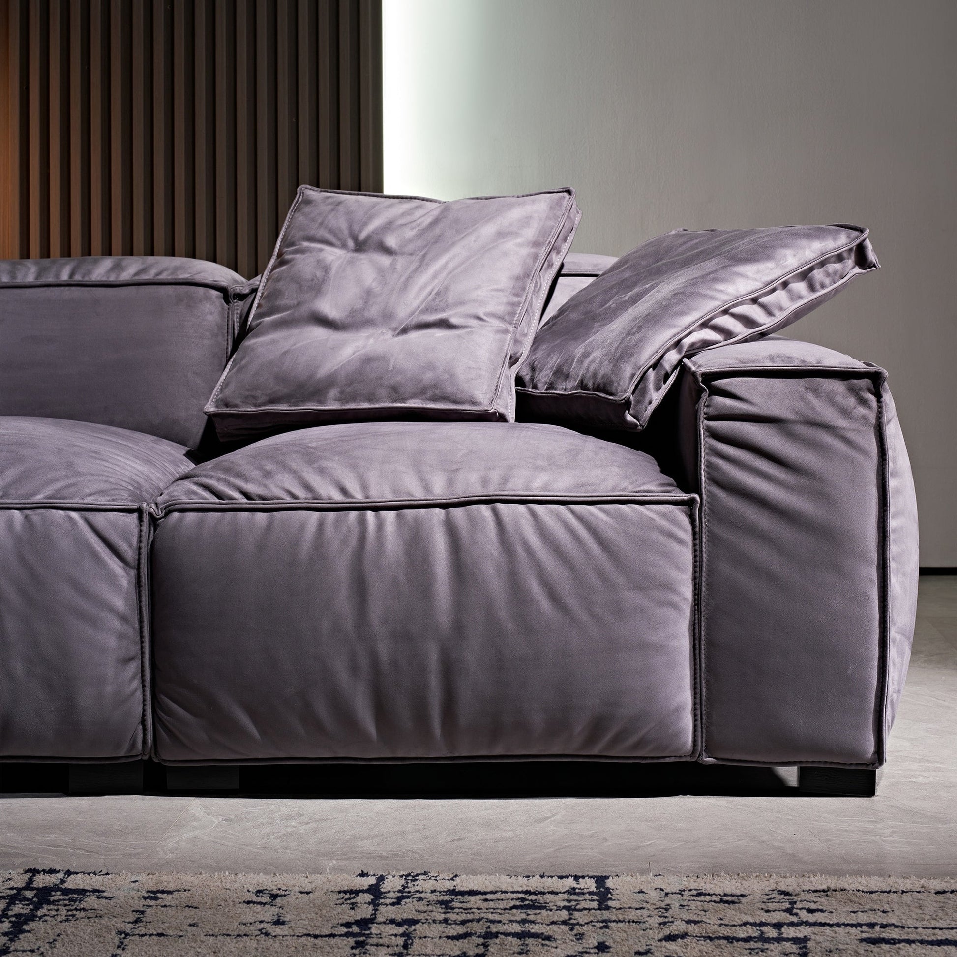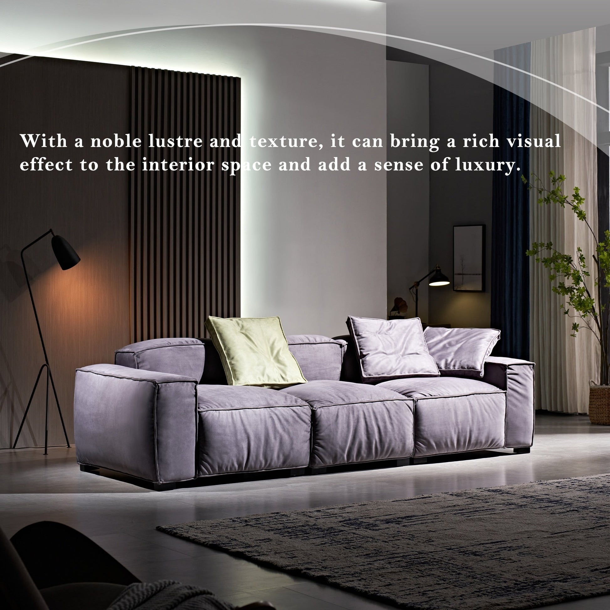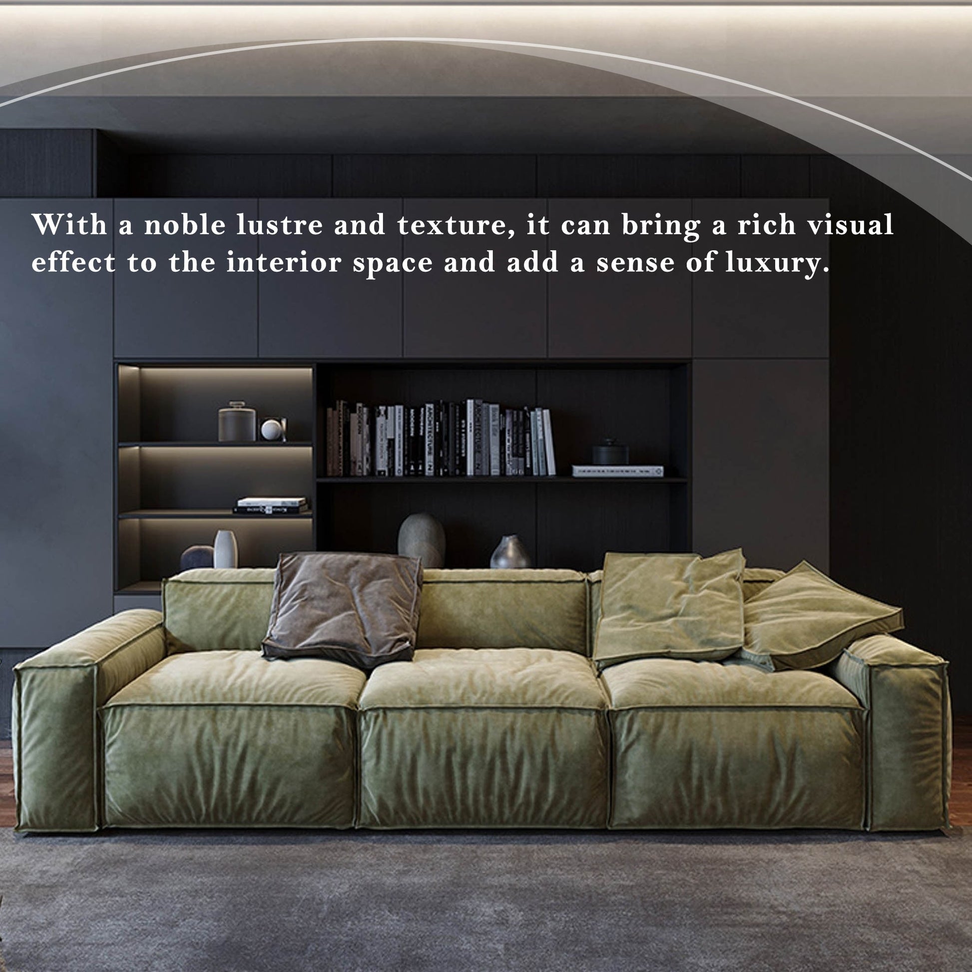 Le canapé est fabriqué en daim souple, d'une teinte vert clair légèrement brillante, créant une atmosphère chaleureuse et confortable. Son design général, simple et moderne, aux lignes épurées, évoque un luxe discret. Sa forme carrée et ses coussins épais procurent stabilité et confort. Le canapé est composé de plusieurs coussins indépendants, chacun orné de surpiqûres apparentes sur les bords, ajoutant dimension et hiérarchie. Le dossier et les accoudoirs, également carrés, s'harmonisent avec le style général. Deux coussins colorés sont inclus, ajoutant au confort et à la richesse visuelle du canapé.