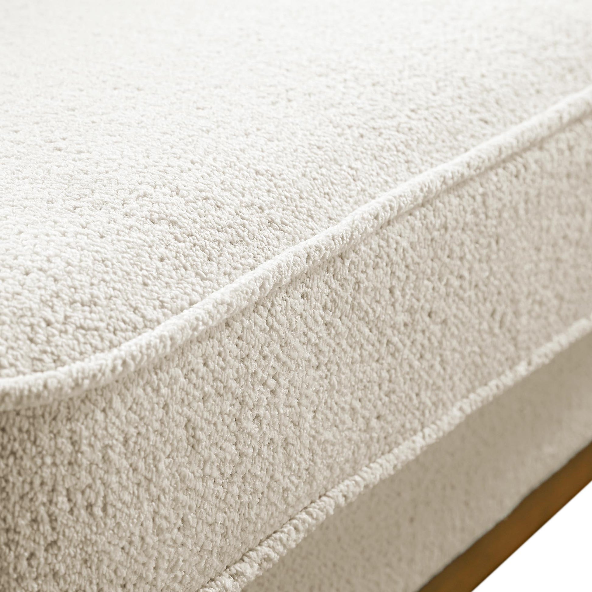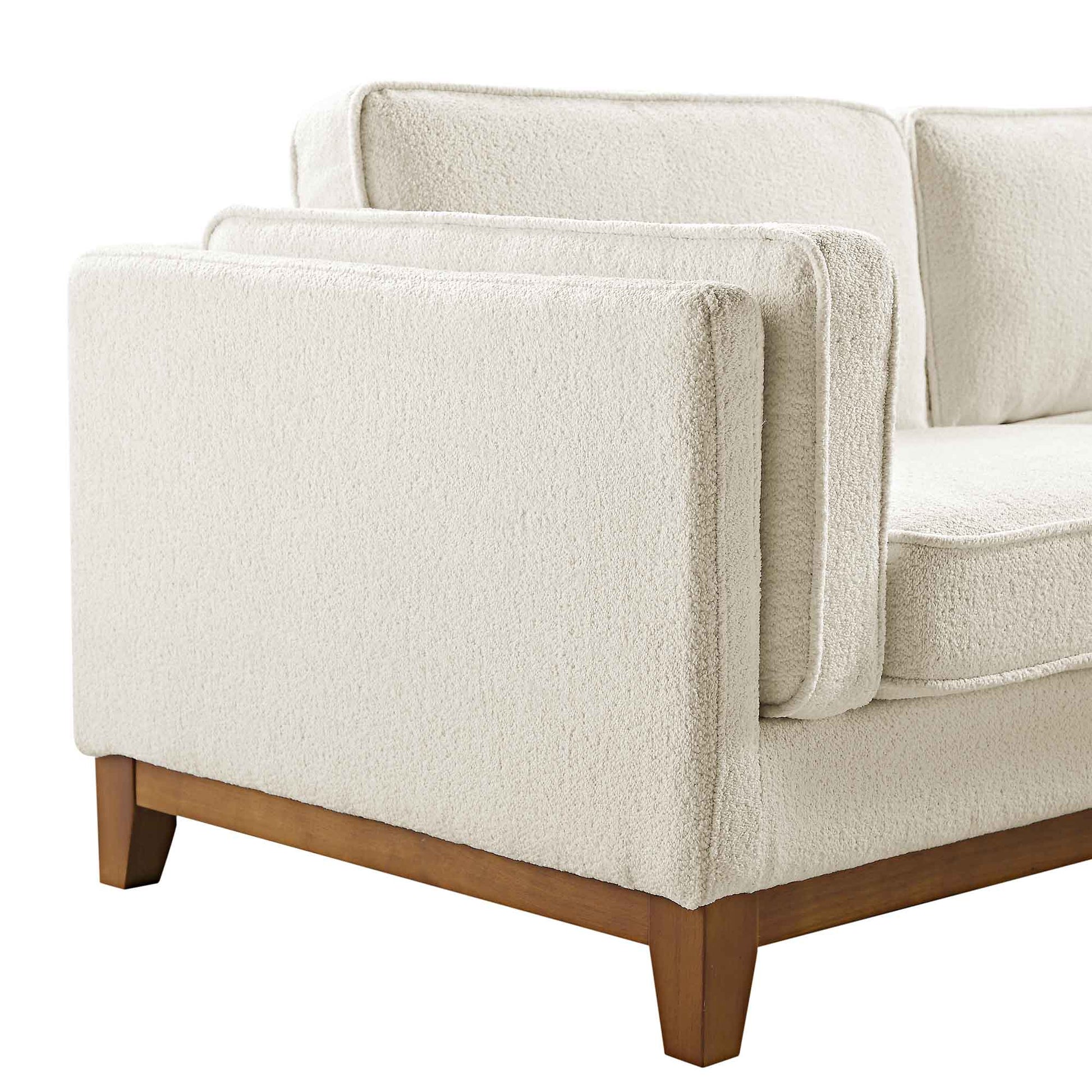 La combinaison d'un tissu bouclé beige et d'une base en bois massif offre une ambiance chaleureuse et terreuse