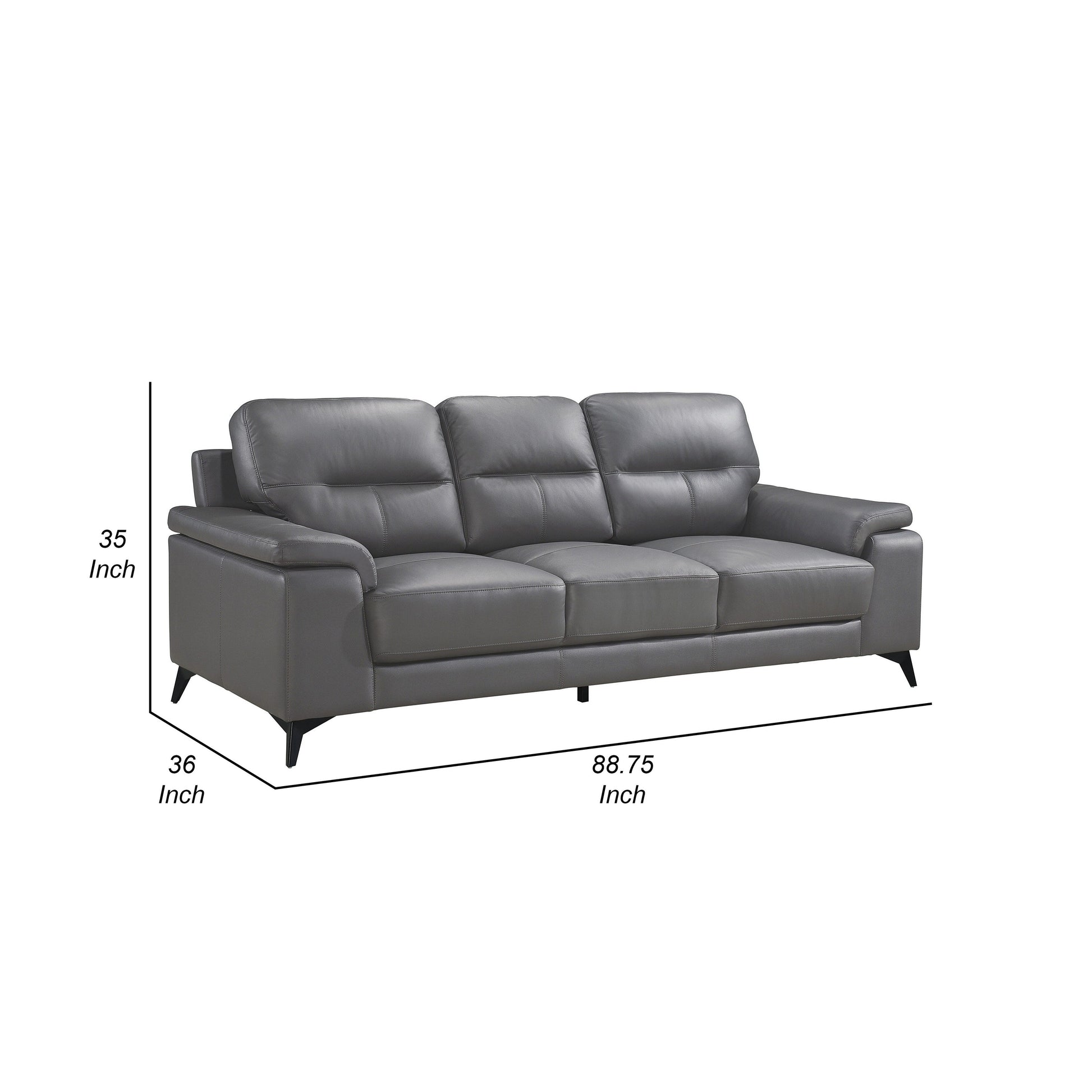 Sublimez votre espace de vie avec les lignes épurées et modernes de ce canapé. Construit sur une structure en bois massif et contreplaqué, il est doté de coussins d'assise en mousse haute densité et d'un revêtement en cuir pleine fleur gris foncé, avec un similicuir résistant assorti sur les côtés et le dossier. Ses accoudoirs profilés et ses pieds en métal noir lui confèrent une finition audacieuse et épurée. Découvrez notre collection Mica pour plus d'options.