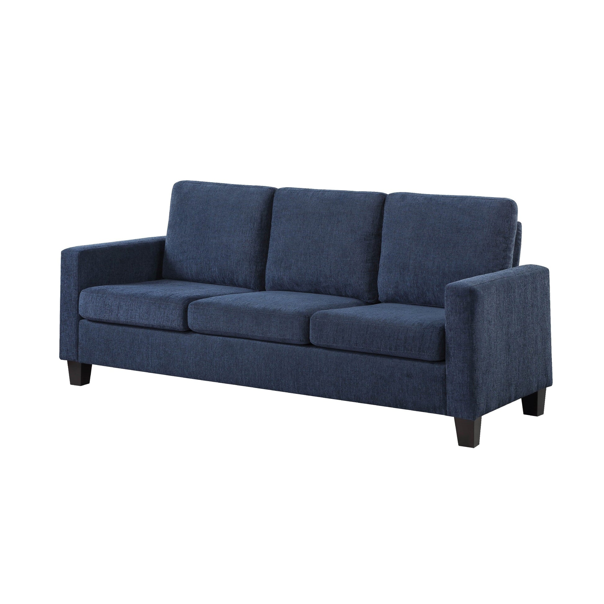 Alliez confort et sophistication avec ce canapé polyvalent, idéal pour les intérieurs transitionnels comme modernes. Construit avec une structure en bois massif robuste et durable, il est revêtu d'un tissu bleu. Ses accoudoirs droits et ses pieds noirs fuselés rehaussent à la fois confort et élégance. Explorez notre collection Mihi pour plus d'options.