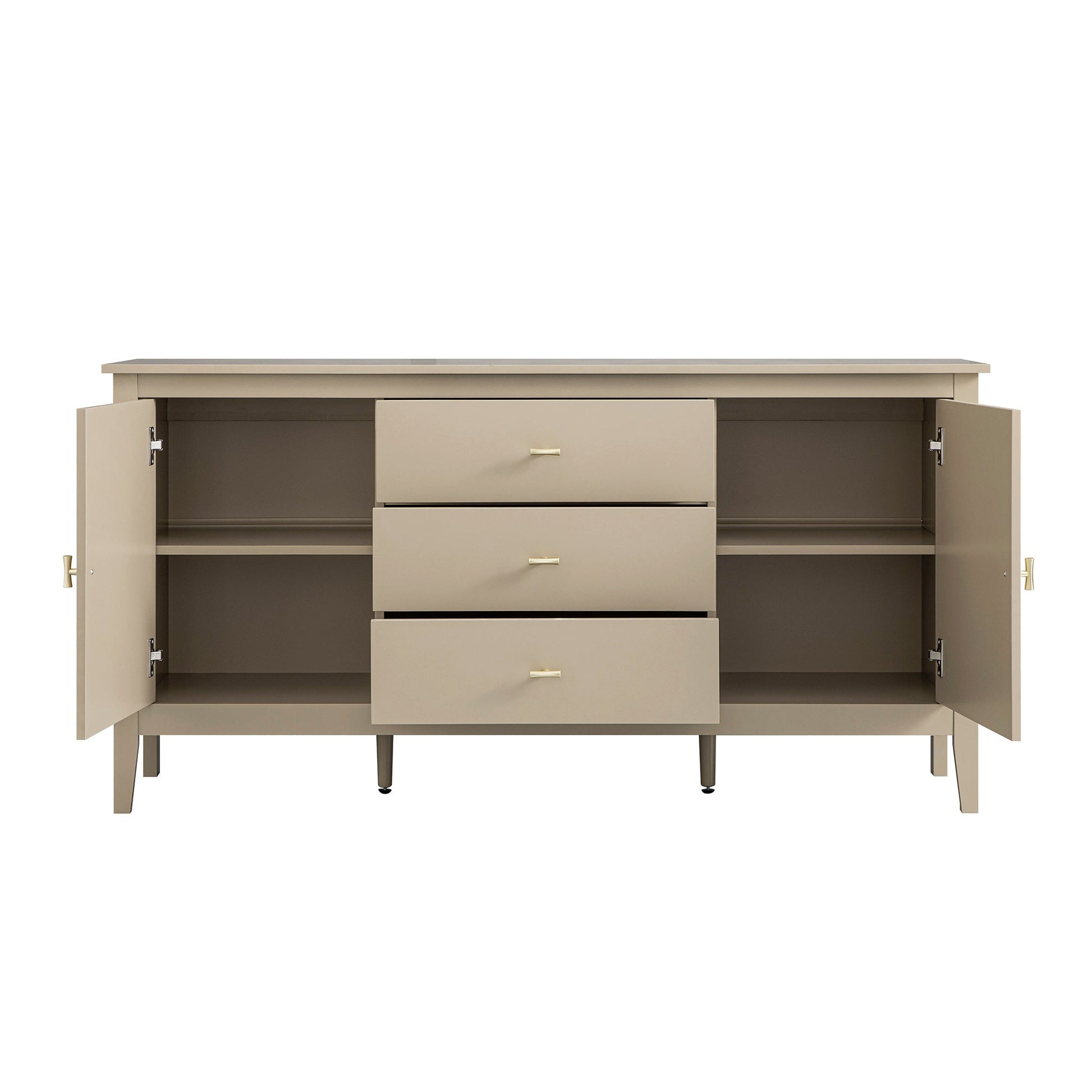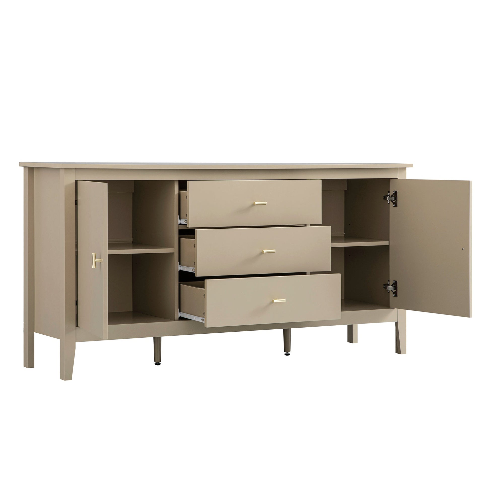 Avec sa silhouette épurée et sa largeur généreuse de 145 cm, il offre un vaste espace de rangement sans encombrer la pièce. Derrière les portes à fermeture douce, des étagères réglables offrent un espace modulable pour tout, de la vaisselle au linge de maison, tandis que trois tiroirs centraux coulissant sur des glissières métalliques sont parfaits pour ranger couverts, papeterie et essentiels du quotidien.